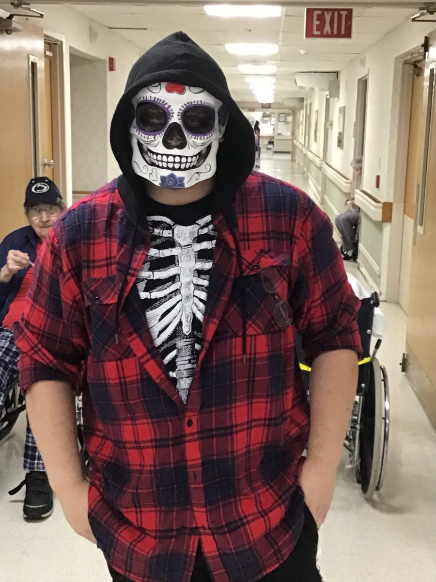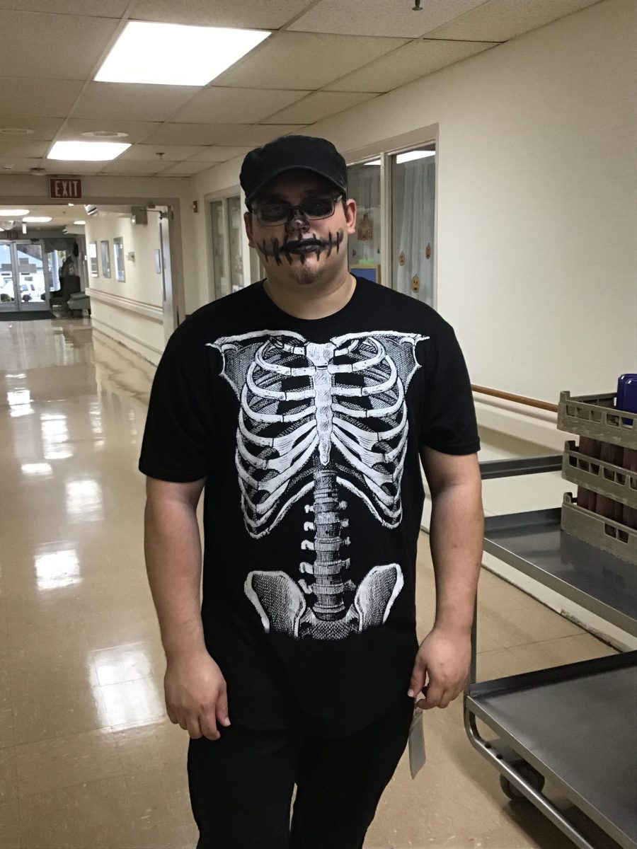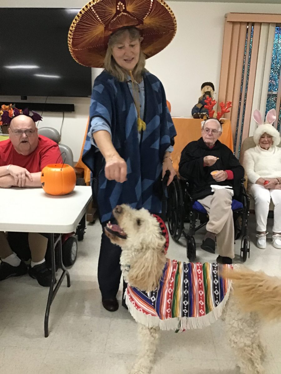 The Residents of Mahoning Valley Nursing and Rehabilitation Center were brought to the Emerald Grande Room to watch the parade of costumes walk past. Everyone young and old like to participate in our Halloween Celebration. 2 legs and 4 legs get all excited to dress up for our residents. Once inside the Grande room, our judges pick winners out of 5 categories. This years judges were Nancy S. from Activities and B. Hahn – Resident Council president.