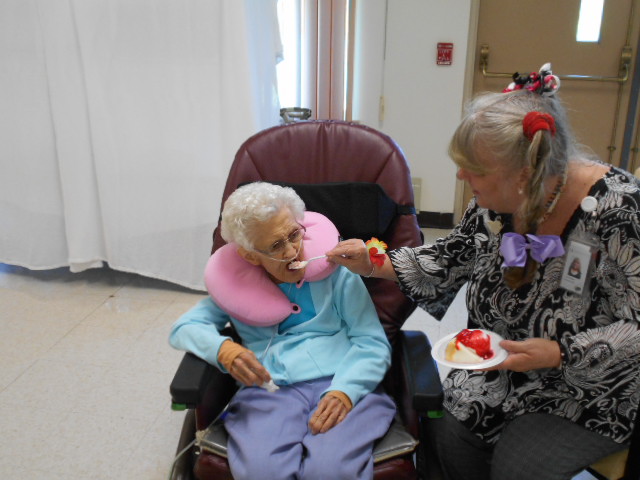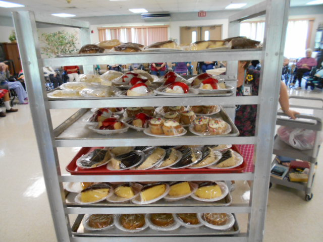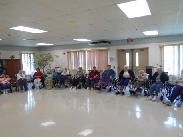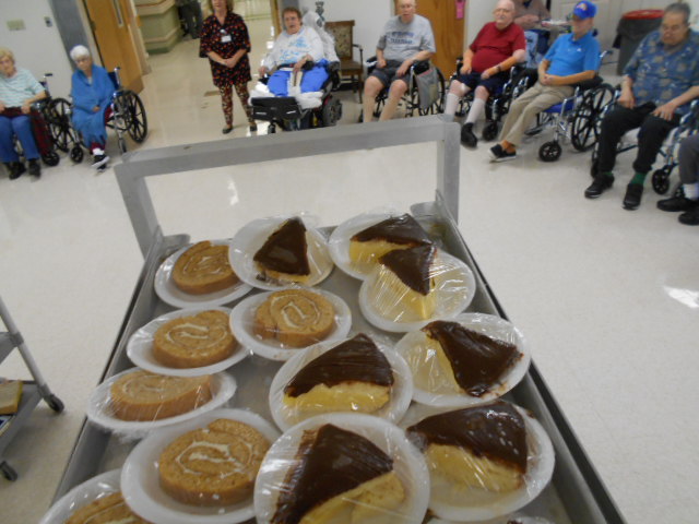 The staff was walking around in “mix & match” clothing, residents enjoyed a Cake Walk with lots of goodies from The Dietary Department. We had a full circle plus waiting for their chance at a treat. Everyone won!