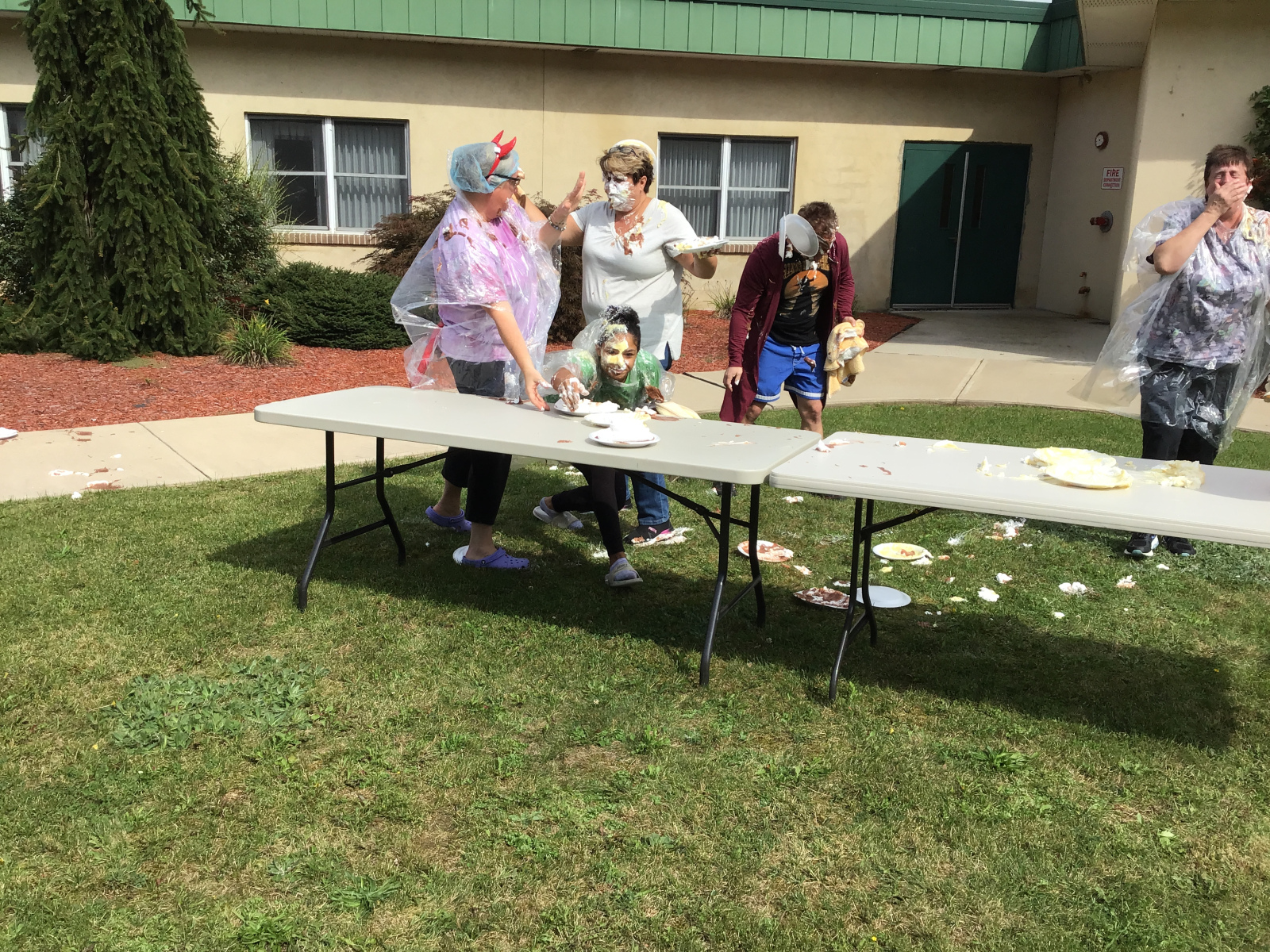 The next big event of the Fair was the Pie Eating Contest where 5 staff members competed for the bragging right of being the winner. Cornelia, from the Dietary Department, was declared the winner and is ready to defend her title next year! Within seconds, a free-for-all began among the competitors, as pies were pushed into faces, dumped on top of heads, and a number of pies were thrown thru the air. There was much laughter and cheering among the residents, staff, and guests as they watched the antics of the competitors.