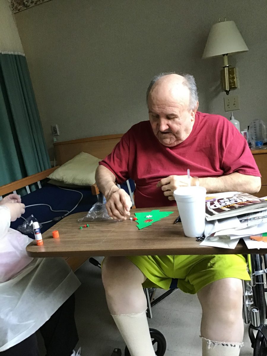 As Glenn was entertaining everyone with his music, activity staff members, Nancy S. and Mary C., decorated the tree.  As the tree decorating continued, residents were asked where additional ornaments and trimmings were needed to be placed, so the tree wouldn’t have bare areas. Within the hour, the tree was decorated to everyone’s satisfaction.