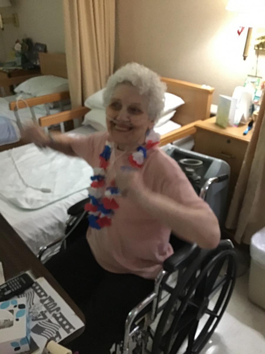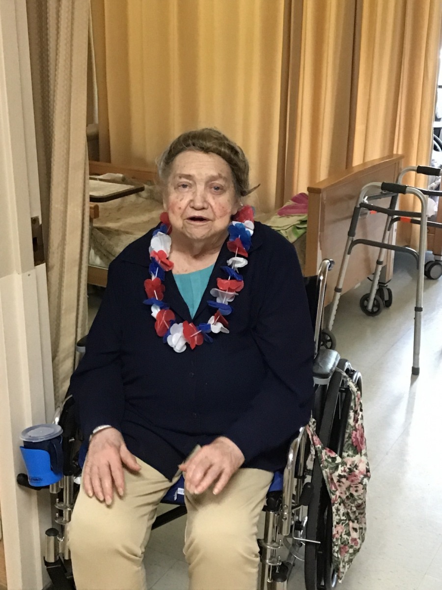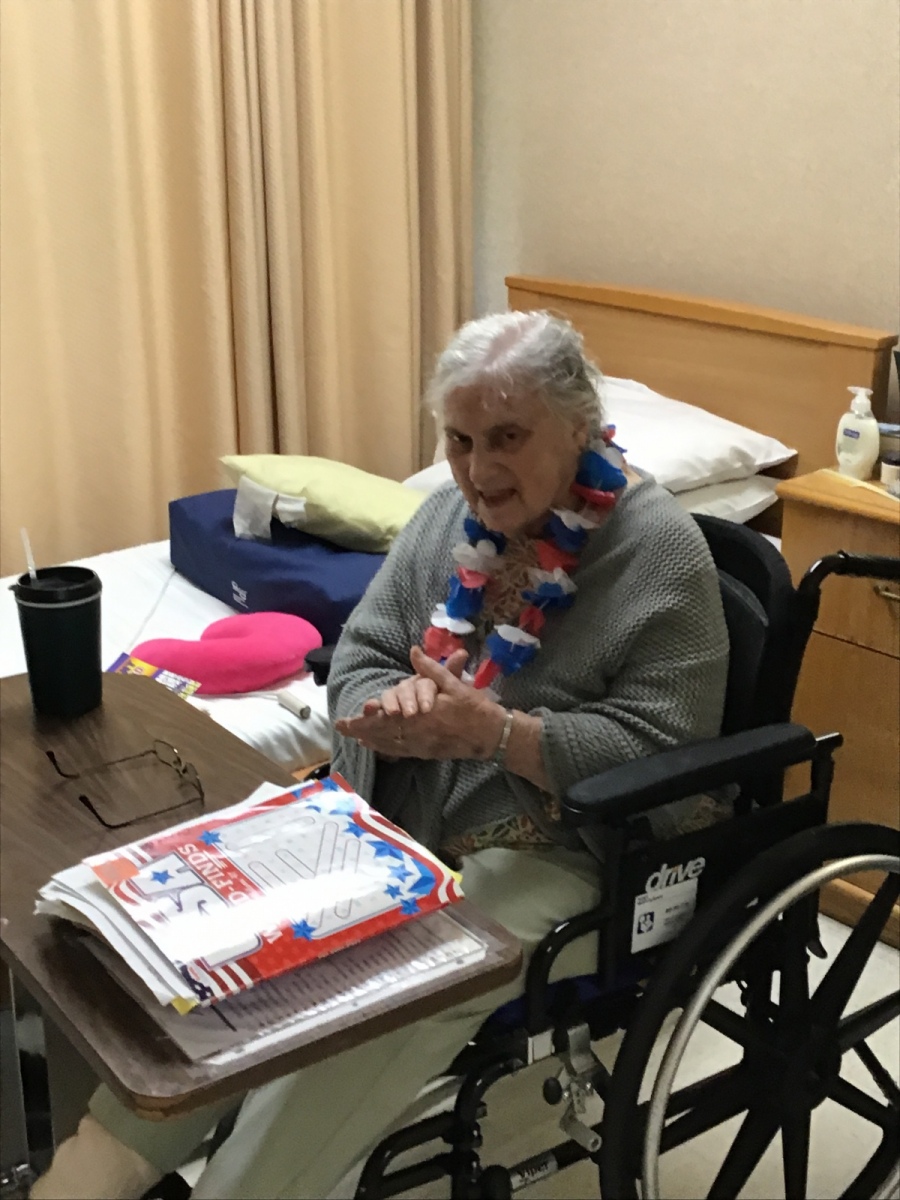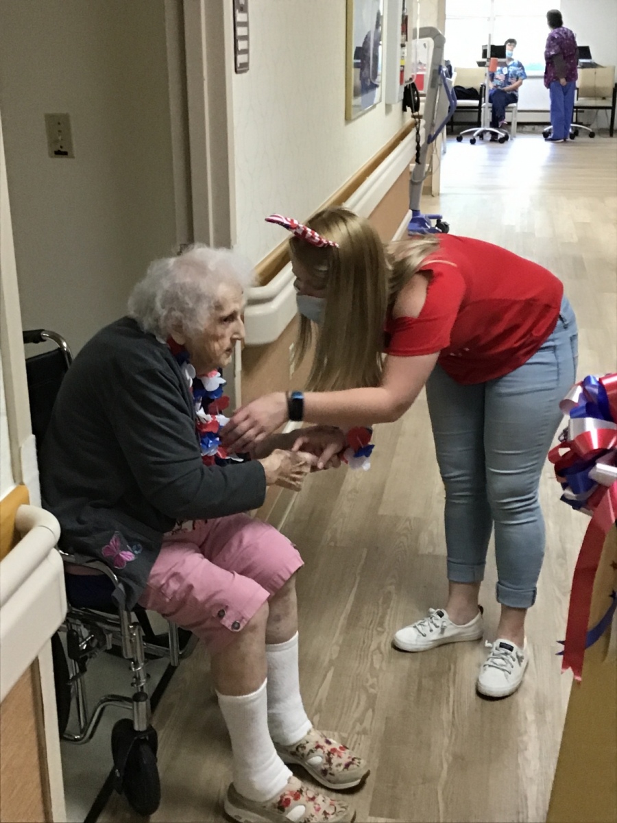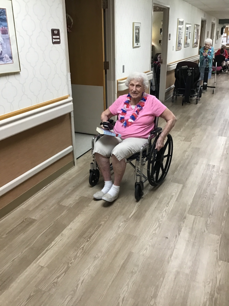 So the Activities staff and Brenda danced around the halls in their Red, White, and Blue giving each resident a Red, White, and Blue flowered necklace. Fun was had by all as we walked each hall singing, dancing, and celebrating our Independence. Enjoy the pictures and video clips.