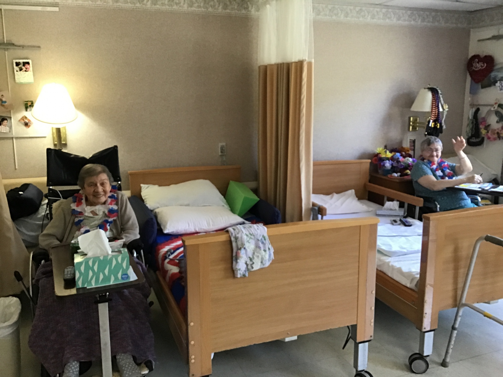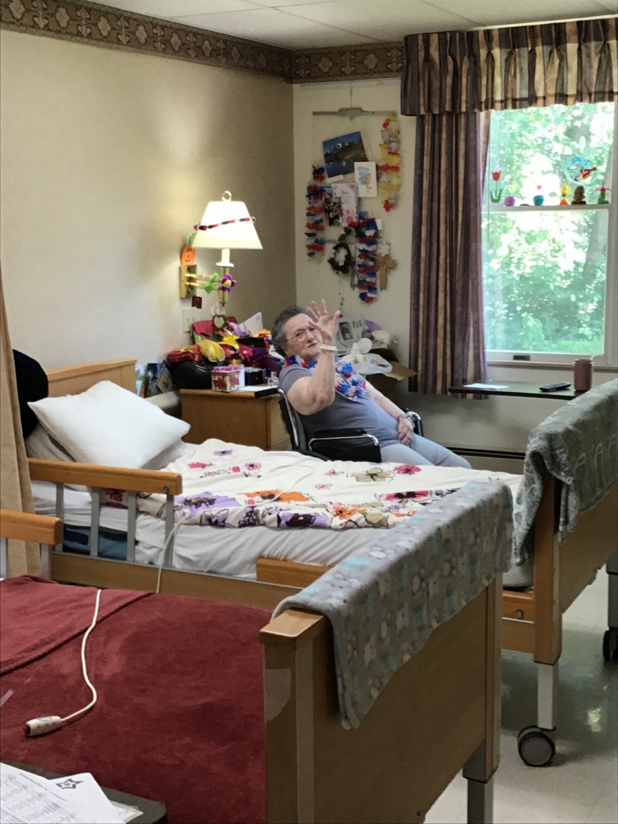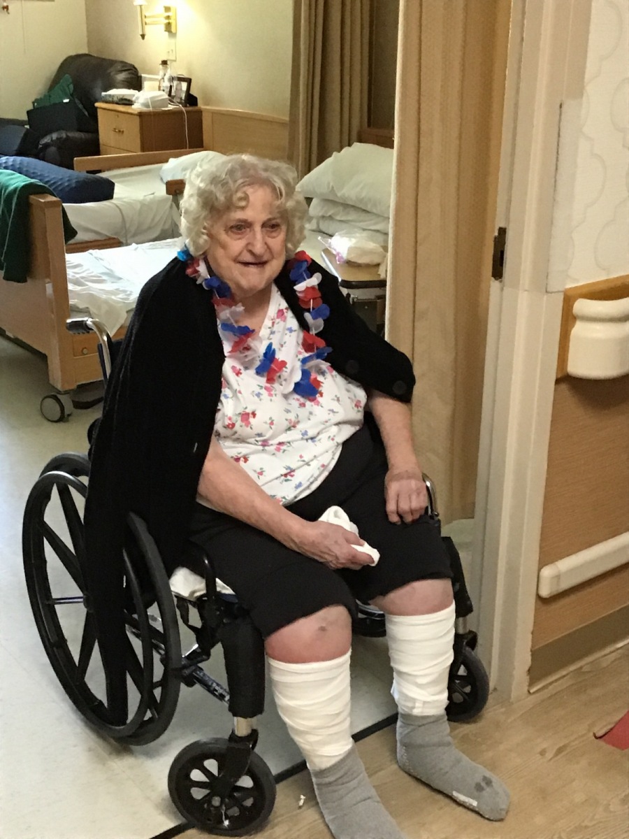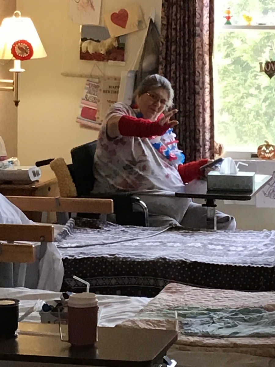 So the Activities staff and Brenda danced around the halls in their Red, White, and Blue giving each resident a Red, White, and Blue flowered necklace. Fun was had by all as we walked each hall singing, dancing, and celebrating our Independence. Enjoy the pictures and video clips.