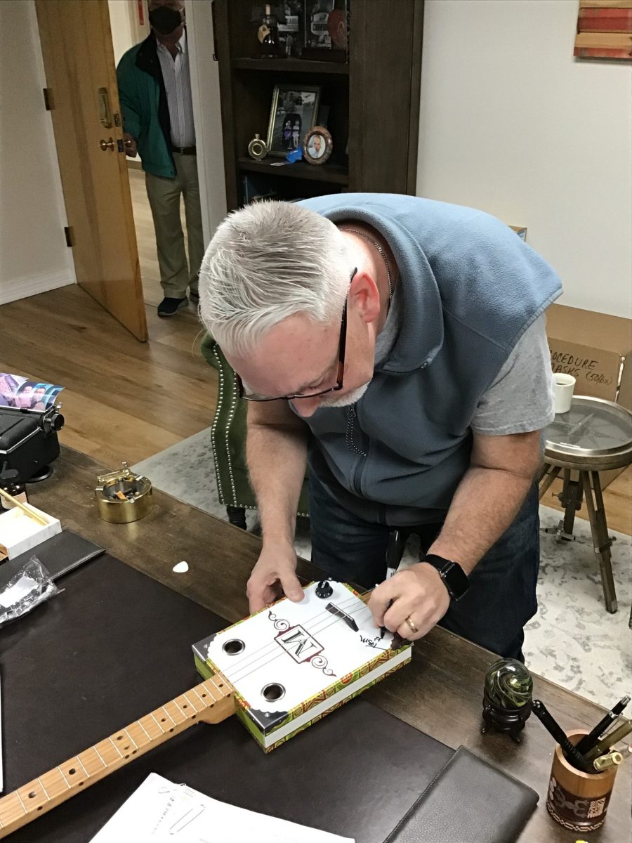 The Facility has received 2 special homemade instruments which are “Cigar Box Guitars, from Barry McCue owner of “Bear Box Guitars”, to display for our residents, families, and staff. When Barry was asked when and how he started this hobby, he told us he has always been intrigued by handmade instruments. Specifically, Cigar Box Guitars. Barry gave us a little back story on how this came to be in his own words.